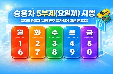 자원안보위기 극복을 위한 승용차 5부제에 동참해 주세요! 자원안보위기 경보 해제 시까지 구민 여러분의 협조 부탁드립니다. ![]() ○ 공영(부설)주차장 승용차 5부제(요일제) 시행 안내 * 시행기간 : 2026. 4. 8.(수) ~ 경보 해제 시까지 * 대상 : 중구 공영(부설)주차장 방문 민간승용차 * 차량번호 끝자리 기준 요일별 운행 제한(해당요일 출입제한) ![]() * 제외차량 1. 전기차·수소차 (경차 X, 하이브리드 X) 2. 장애인(동승 포함), 국가유공자 본인, 임산부, 미취학 유아 동승 차량 3. 승합차, 화물차, 생계형 차량(택시 등) 담당부서 행정지원과(02-3396-4508) |