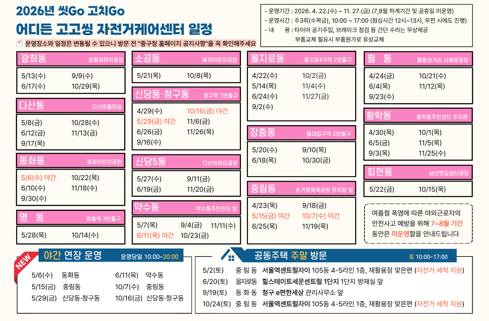 ※ 장소 및 일정은 기상상황, 현장여건 등 상황에 따라 변동 가능하니 반드시 방문 전 홈페이지 공지사항(변동사항) 사전 확인 ■ 운영기간 : 2026. 4. 22.(수) ~ 11. 27.(금) [7, 8월 하계기간 제외] ※ 여름철 폭염에 따른 야외근로자의 안전사고 예방을 위해 7~8월 기간 동안은 미운영함을 양해 부탁드립니다. ■ 운영시간 : 10:00 ~ 17:00 (점심시간 12~13시, 우천 시에도 진행, 공휴일 미운영) - 주3회(수, 목, 금) 동별 지정장소 - 주말(토요일) 일부 공동주택 ※ 수리시간을 고려하여 늦어도 16:30까지 방문 ■ 운영장소 : 각 동별 지정장소 및 일부 공동주택 - 청구동 : 신당8구역 주택재개발 공사로 인해 신당동(청구역 1번 출구)과 통합 운영 - 신당5동 : 꿈누리어린이공원→다산어린이공원으로 변경 ■ 사업내용 : 자전거 간단 무상수리(체인, 기어, 브레이크 점검, 타이어 공기주입, 부식 제거, 광택 등) ※ 소모품 교체 필요 시 원가 비용으로 저렴하게 교체 ■ 문의 : 중구청 교통행정과 ☎02-3396-6215