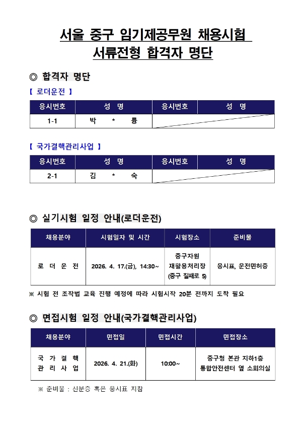 | 서울특별시 중구 임기제공무원 채용시험 서류전형 합격자 공고(로더운전, 국가결핵관리사업) | |||