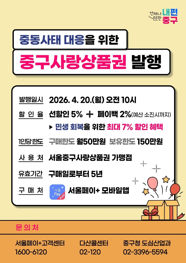 "서울중구사랑상품권"을 발행합니다. 꽃피는 4월, 우리 동네 상권에도 따뜻한 봄바람을 불어넣어 주세요. □ 기본 혜택(7%) ○ 선할인 5% : 상품권 구매 즉시 할인 ○ 페이백 2% : 상품권 사용 시 사용액의 2%를 중구사랑상품권으로 페이백 ※ 사용일 기준 익월 20일 지급 □ 발행개요 ○ 발 행 일 : 2026.4.20.(월) 오전 10시 ~ (소진 시까지) ○ 할 인 율 : 5% ○ 페 이 백 : 2% ○ 유효기간 : 구매일로부터 5년 ○ 1인당한도 : (구매) 월 50만원, (보유) 150만원 ○ 사 용 처 : 서울중구사랑상품권 가맹점 ○ 구 매 처 : 서울페이플러스 앱 □ 이용안내 ○ 선물하기 : 선물받기 한도 월 150만원(=보유한도), 현금(계좌이체/체크카드) 구매 시에만 선물 가능 ○ 환불규정 : (전액환불) 상품권 미사용 시 전액 취소 가능 (잔액환불) 현금 구매의 경우 보유금액 60% 이상 소진 시 잔액 환불 가능 ※ 신용카드 구매 시 : 선물하기 및 부분 환불 불가 ○ 환불방법 : 상품권 유효기간 내에 서울페이+ 앱으로 환불신청 ![]() |