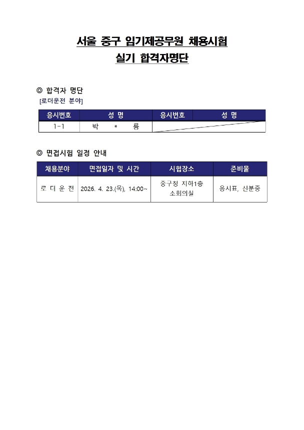 | 서울특별시 중구 임기제공무원 채용 실기시험 합격자 공고(로더운전) | |||