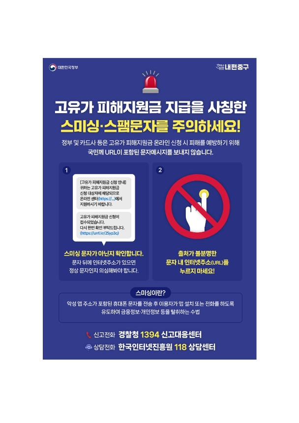 고유가 피해지원금 신청 안내 ㅇ [신청대상] 소득하위 70%의 국민 -(1차) 기초수급자, 차상위계층·한부모가족 -(2차) 소득하위 70% 이하 국민 ㅇ [신청기간] - (1차) 2026. 4. 27.(월) ~ 5. 8.(금) - (2차) 2026. 5. 18.(월) ~ 7. 3.(금) ※ 1차 미신청자의 경우 2차 기간에 신청 가능 ㅇ [지원금액] -(1차) 기초수급자(55만 원), 차상위계층·한부모 가족(45만 원) -(2차) 소득 하위 70% 이하 국민 (10만 원) ※ 1차 기간에 신청·지급받은 경우, 2차 기간에는 신청·지급 불가 ㅇ [신청방법] (신용·체크카드, 모바일 서울사랑상품권, 선불카드 중 선택) - 신용·체크카드: 카드사 홈페이지·앱 또는 제휴 은행 영업점 방문 - 서울사랑상품권(모바일): 서울사랑상품권(서울페이+) 앱 - 선불카드: 주소지 관할 동 주민센터 방문 ㅇ [사 용 처] 연 매출 30억 원 이하 서울사랑상품권 가맹점 ·소상공인 매장 등* * 유흥·사행업종, 환금성 업종 등 제외 ㅇ [사용기한]: 2026. 8. 31.(월)까지 ※ 미사용 금액 자동 소멸 ㅇ [ 고유가 피해지원금 콜센터 연락처 ] - 정부 전담 콜센터 : 1670-2525 - 정부 민원안내 콜센터 : 110 - 중구청 콜센터: 추후 안내 예정 ![]() ![]()
