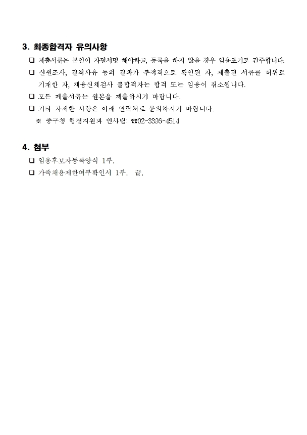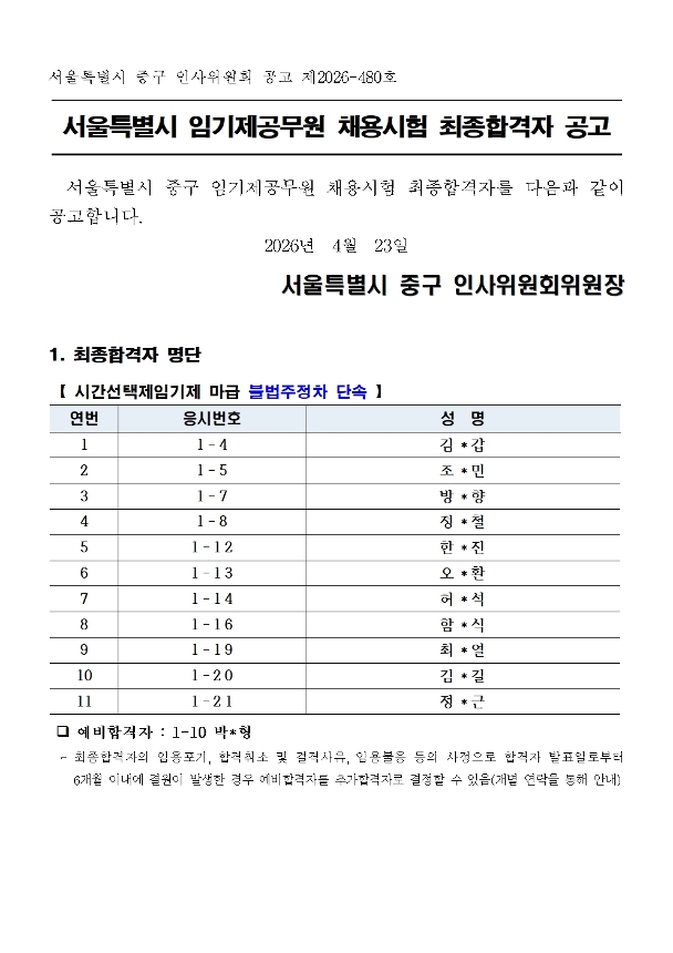 | 서울특별시 중구 임기제공무원 채용시험 최종합격자 공고(불법주정차 단속, 식품접객업소관리, 금연상담사, 국가결핵관리사업) | |||