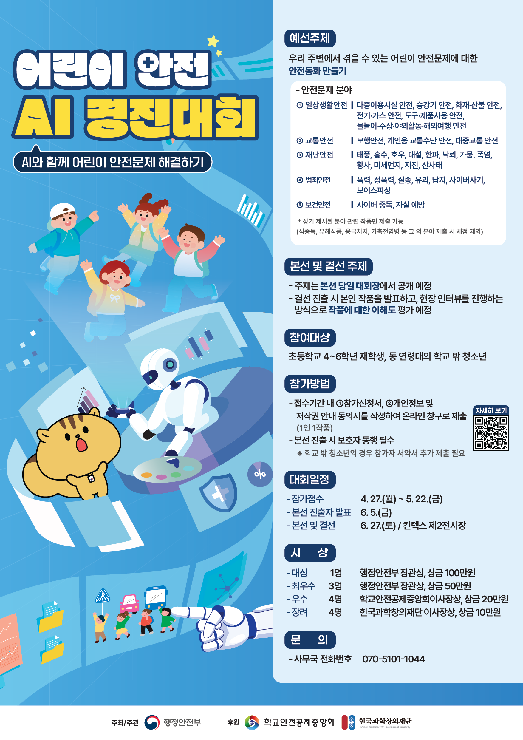 2. 이와 관련하여, 박람회의 주요 행사인 ①도전! 어린이 안전 골든벨, ②어린이 안전 AI 경진대회의 참가자 모집을 아래와 같이 안내하오니, 안전에 관심이 있는 초등학생들은 적극 참여 부탁드립니다. 가. 참여대상: 초등학교 4~6학년 재학생, 동 연령대 청소년 나. 신청기간: 2026. 4. 27.(월) ~ 5. 22.(금) 다. 신청방법: 홍보 포스터의 QR코드를 촬영하여 안내에 따라 신청 ![]() ![]()