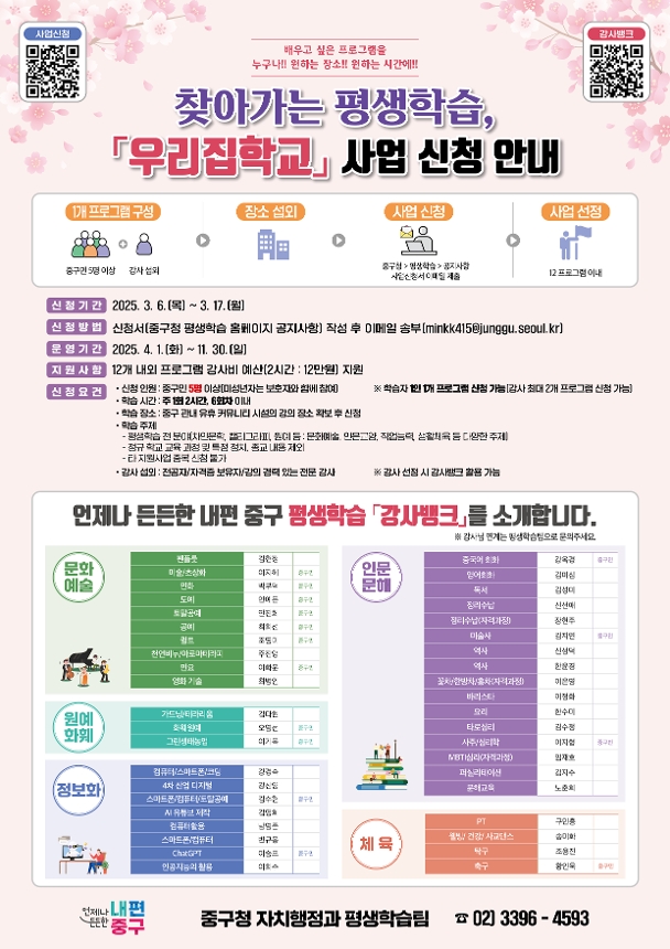 주민 누구나!! 배우고 싶은 평생학습 강좌를!! 원하는시간!! 원하는 장소를 직접 계획하여 신청하는 주민 맞춤형 평생학습 프로그램입니다. - 모집개요 - ■ 신청기간 : 2025. 3. 6.(목) ~ 3. 17.(월)까지 ■ 신청방법 : 신청서 다운로드 후 이메일(minkk415@junggu.seoul.kr) 제출 ※ 이메일 발송 후 확인 필수(발송 오류 등으로 담당자 이메일로 들어오지 않은 경우 대비) ※ 신청기간 전에 제출하거나 마감된 후 제출된 건은 인정되지 않습니다. ■ 지원사항 : 12개 내외 프로그램 강사비 예산 지원(강사비 2시간 : 12만원) ※ 프로그램 종료하고 결과보고 제출 시 일괄지급(원천징수 공제 후 지급됨) ■ 운영기간 : 2025. 4월 1일(화) ~ 11월 30일(일) ■ 학습시간 : 주 1회 최대 2시간, 6회차 이내 ■ 모집대상 : 강사 1명+중구민 5명 이상(미성년자 보호자 동반 참여) / 12개 내외 프로그램 ※ 학습자 1인 1개 프로그램 신청 가능(강사 1인 최대 2개 프로그램 신청 가능) ※ 매 회차 총인원의 60%이상 출석 ■ 모집분야 : 인문, 생활체육, 문화예술, 문해교육 등 다양한 평생교육 전 분야 ※ 학교 교과목, 특정 종교/정치적 성격을 제외한 과정은 모두 가능!! ※ 지원을 받고 있는 사업 중복 신청 불가 ■ 운영장소 : 관내 유휴 커뮤니티 시설의 강의 장소(장소 확보 후 신청) ■ 강사섭외 : 전공자/자격증 보유자/강의 경력있는 전문 강사 섭외 후 프로그램 구성하여 신청 ※ 중구 강사뱅크 등록된 강사 활용 가능(연계 희망 시 평생학습팀으로 문의) ※ 중구 강사뱅크 미등록 강사는 등록 후 사업 신청 가능 ※ 프로그램 선정 시 강사 증빙 자료 제출 ※ 강사뱅크 집중접수기간(2.4.~2.21.)에 등록 및 우리집학교 홍보 동의하신 강사님 홍보자료 게재 ■ 문의 사항 : 중구청 자치행정과 평생학습팀(02-3396-4593) ![]() |