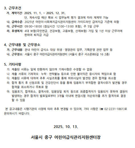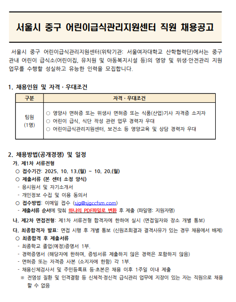 | 서울시 중구 어린이급식관리지원센터 직원 채용공고 | |||