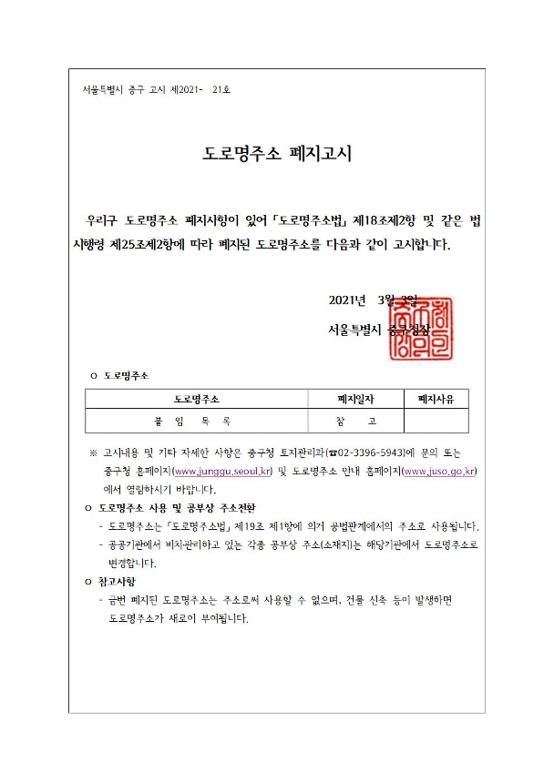 | 분류 | 일반공공행정 > 일반행정 > 주소정책 > 도로명주소 부여 및 폐지 고시 | ||