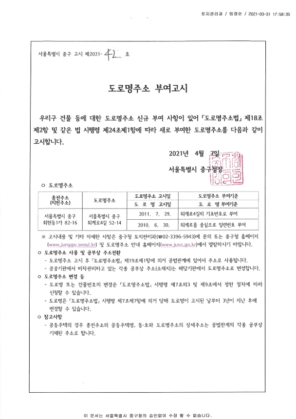 | 분류 | 일반공공행정 > 일반행정 > 주소정책 > 도로명주소 부여 및 폐지 고시 | ||