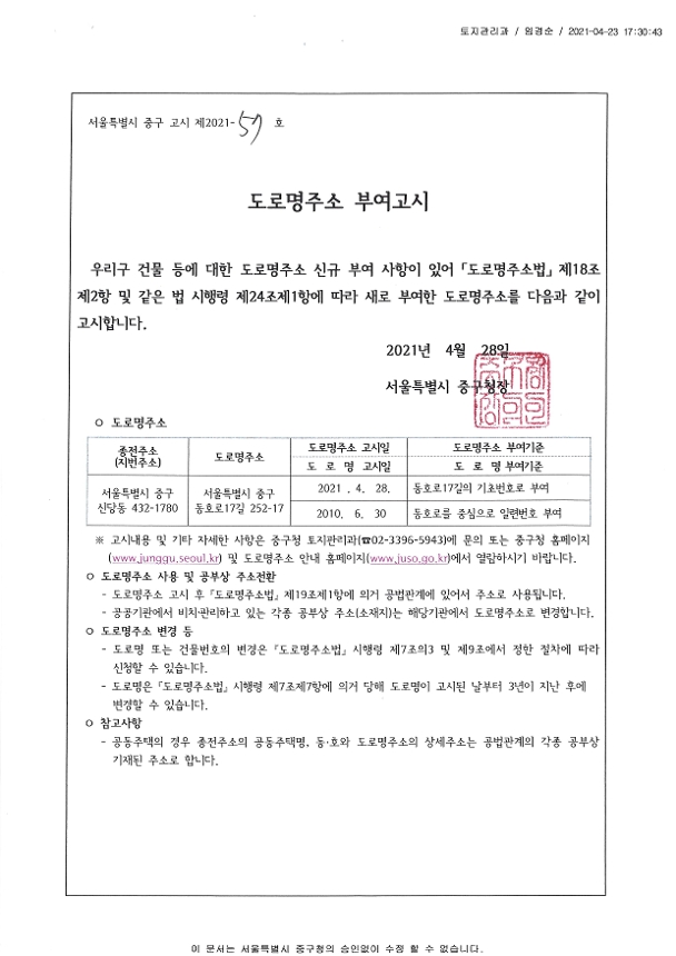 | 분류 | 일반공공행정 > 일반행정 > 주소정책 > 도로명주소 부여 및 폐지 고시 | ||