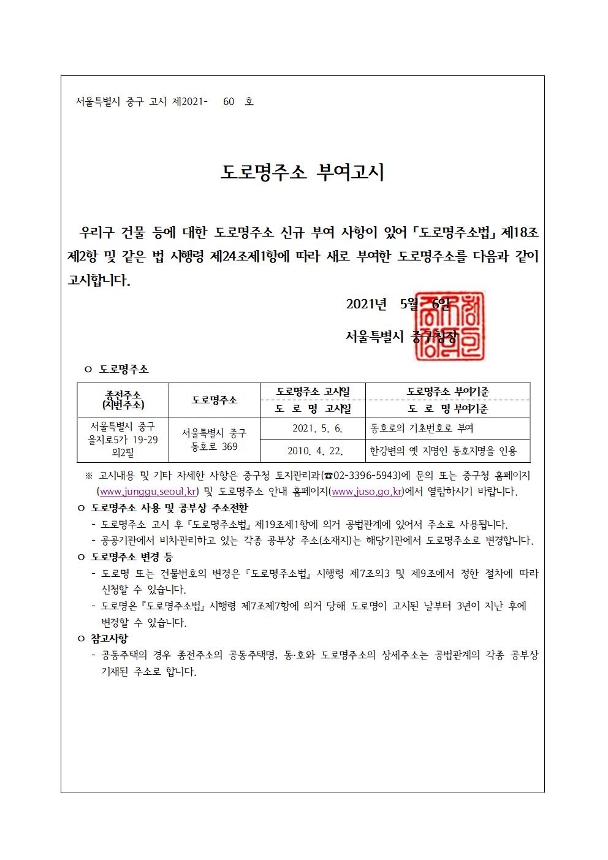 | 분류 | 일반공공행정 > 일반행정 > 주소정책 > 도로명주소 부여 및 폐지 고시 | ||