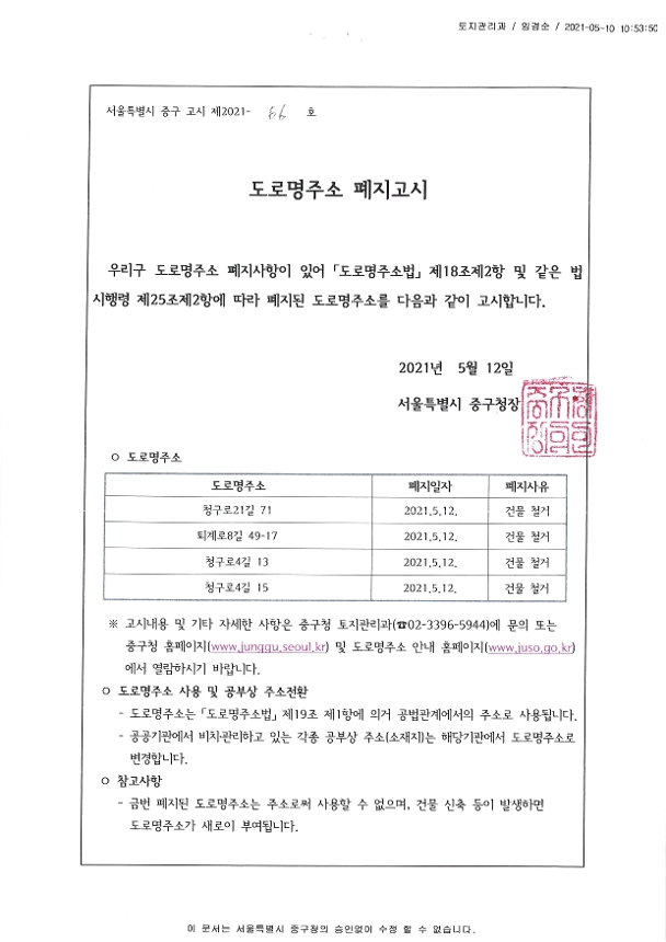 | 분류 | 일반공공행정 > 일반행정 > 주소정책 > 도로명주소 부여 및 폐지 고시 | ||
