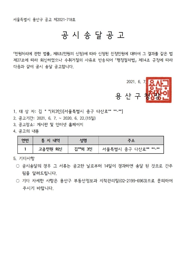 | 제목 | 민원 처리결과 통지반송에 따른 공시송달 공고 | ||