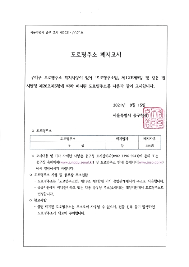 | 분류 | 일반공공행정 > 일반행정 > 주소정책 > 도로명주소 부여 및 폐지 고시 | ||