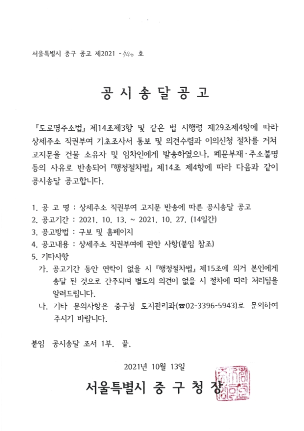 | 분류 | 일반공공행정 > 일반행정 > 주소정책 > 도로명주소 부여 및 폐지 고시 | ||