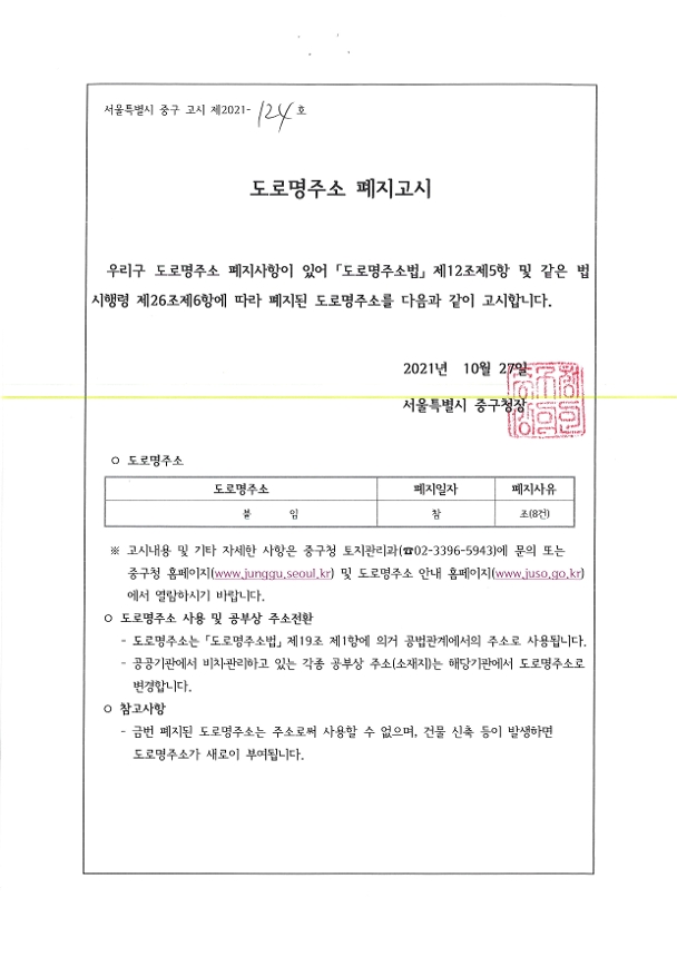 | 분류 | 일반공공행정 > 일반행정 > 주소정책 > 도로명주소 부여 및 폐지 고시 | ||