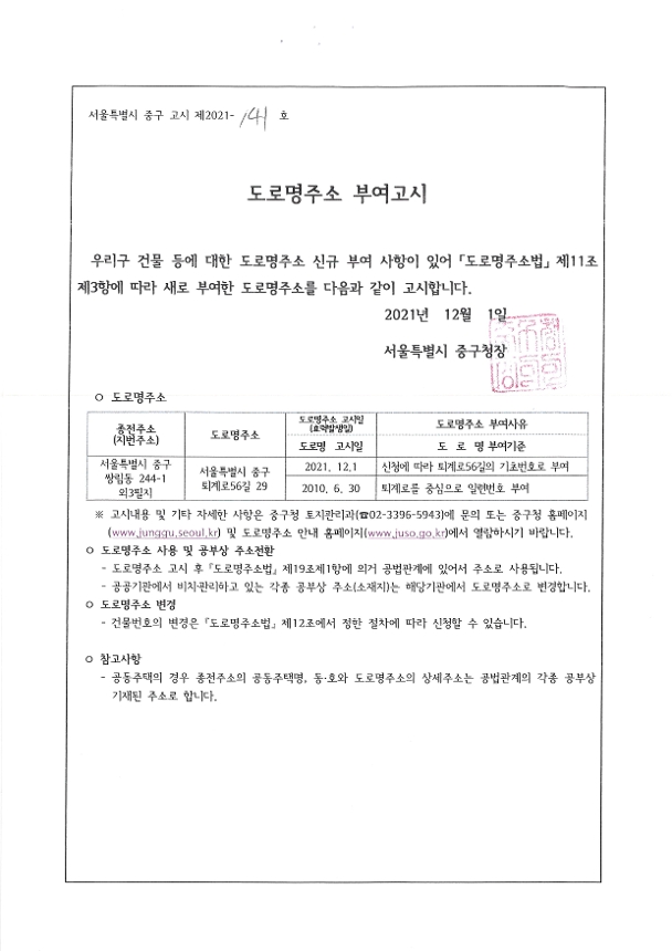 | 분류 | 일반공공행정 > 일반행정 > 주소정책 > 도로명주소 부여 및 폐지 고시 | ||