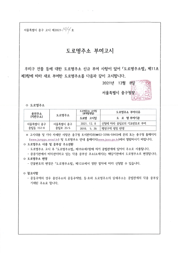 | 분류 | 일반공공행정 > 일반행정 > 주소정책 > 도로명주소 부여 및 폐지 고시 | ||