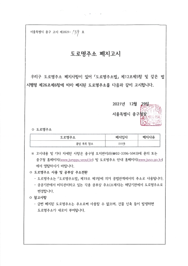 | 분류 | 일반공공행정 > 일반행정 > 주소정책 > 도로명주소 부여 및 폐지 고시 | ||