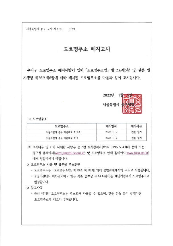 | 분류 | 일반공공행정 > 일반행정 > 주소정책 > 도로명주소 부여 및 폐지 고시 | ||