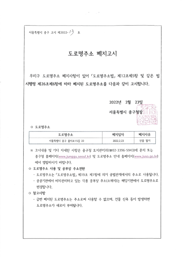 | 분류 | 일반공공행정 > 일반행정 > 주소정책 > 도로명주소 부여 및 폐지 고시 | ||