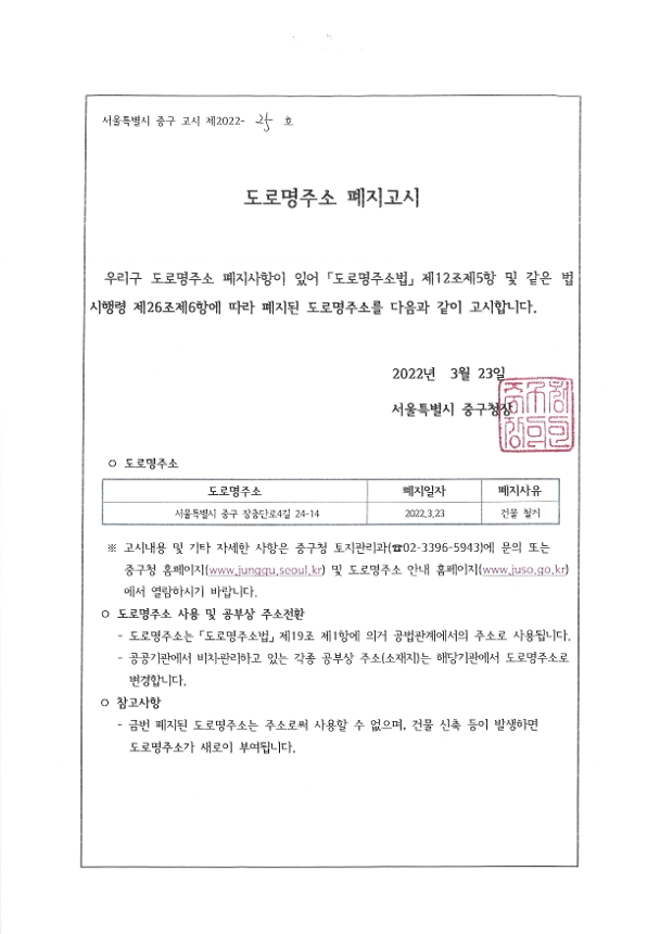 | 분류 | 일반공공행정 > 일반행정 > 주소정책 > 도로명주소 부여 및 폐지 고시 | ||