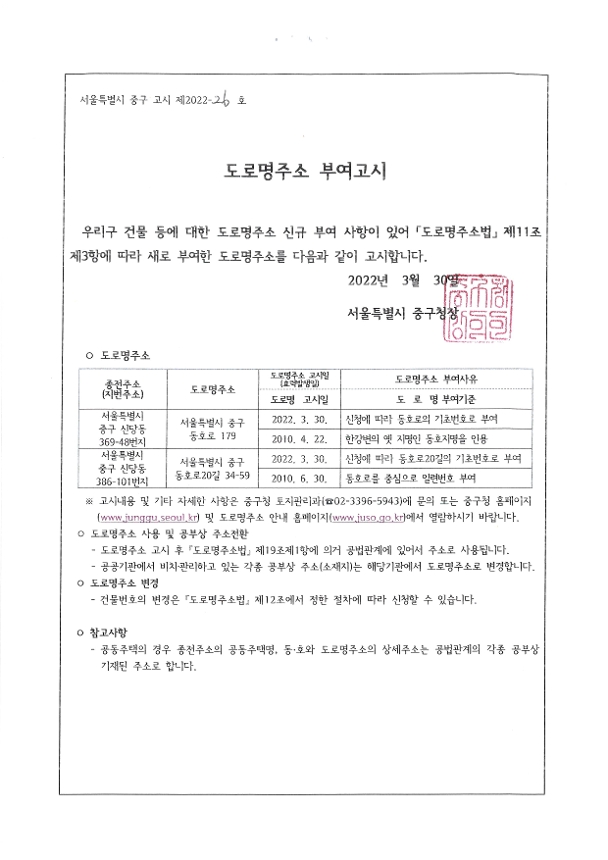 | 분류 | 일반공공행정 > 일반행정 > 주소정책 > 도로명주소 부여 및 폐지 고시 | ||