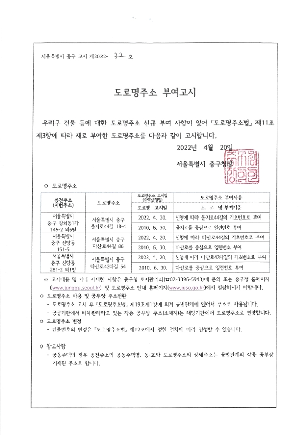 | 분류 | 일반공공행정 > 일반행정 > 주소정책 > 도로명주소 부여 및 폐지 고시 | ||