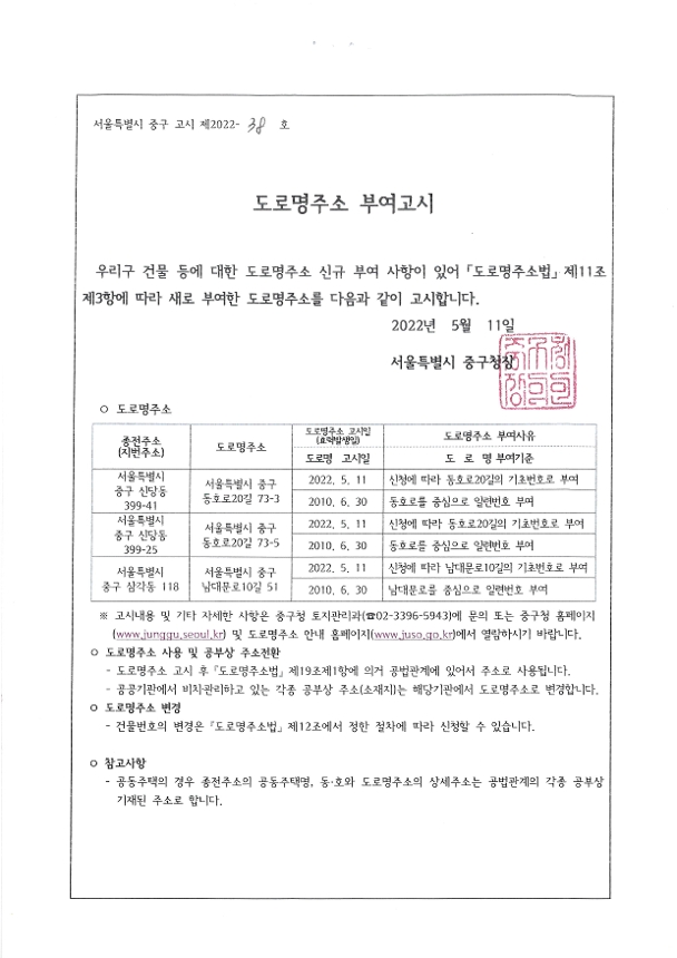 | 분류 | 일반공공행정 > 일반행정 > 주소정책 > 도로명주소 부여 및 폐지 고시 | ||