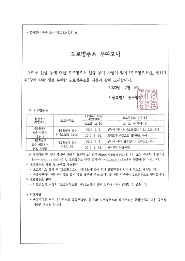 | 분류 | 일반공공행정 > 일반행정 > 주소정책 > 도로명주소 부여 및 폐지 고시 | ||