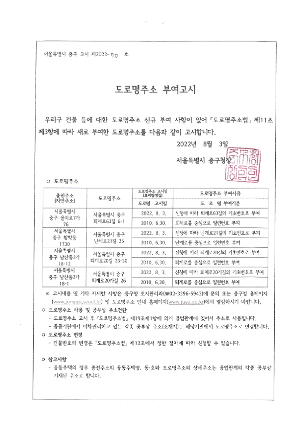| 분류 | 일반공공행정 > 일반행정 > 주소정책 > 도로명주소 부여 및 폐지 고시 | ||