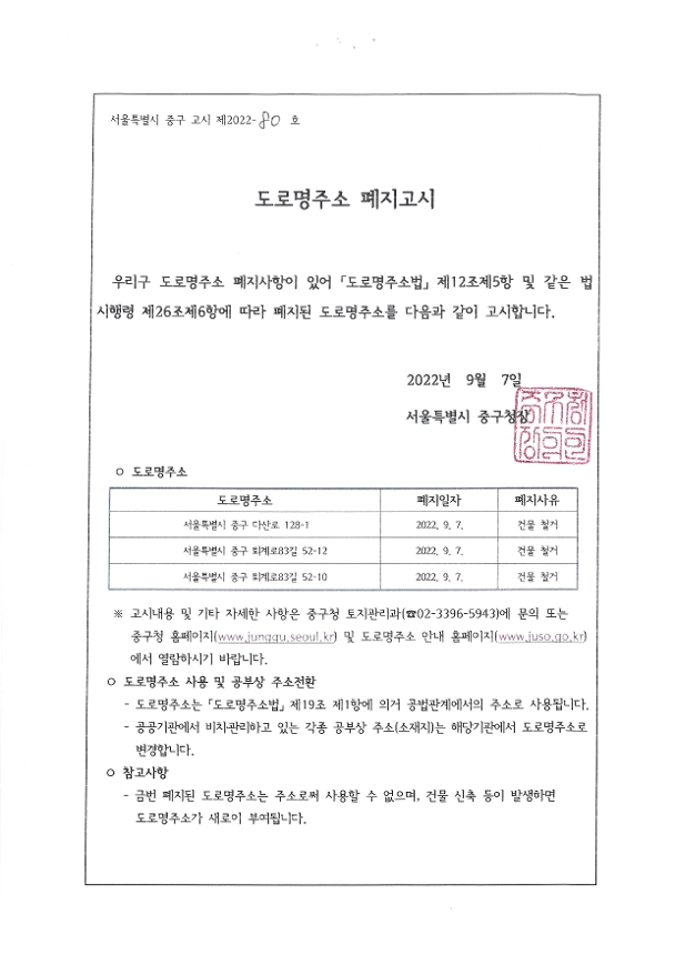 | 분류 | 일반공공행정 > 일반행정 > 주소정책 > 도로명주소 부여 및 폐지 고시 | ||