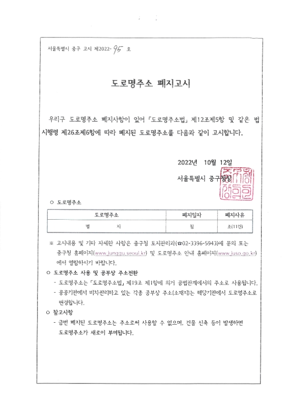 | 분류 | 일반공공행정 > 일반행정 > 주소정책 > 도로명주소 부여 및 폐지 고시 | ||