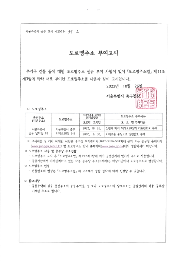 | 분류 | 일반공공행정 > 일반행정 > 주소정책 > 도로명주소 부여 및 폐지 고시 | ||