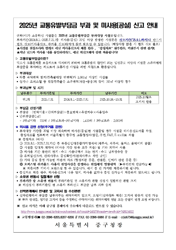 | 분류 | 수송및교통 > 물류등기타 > 대중교통 > 교통유발금 부과 안내 | ||