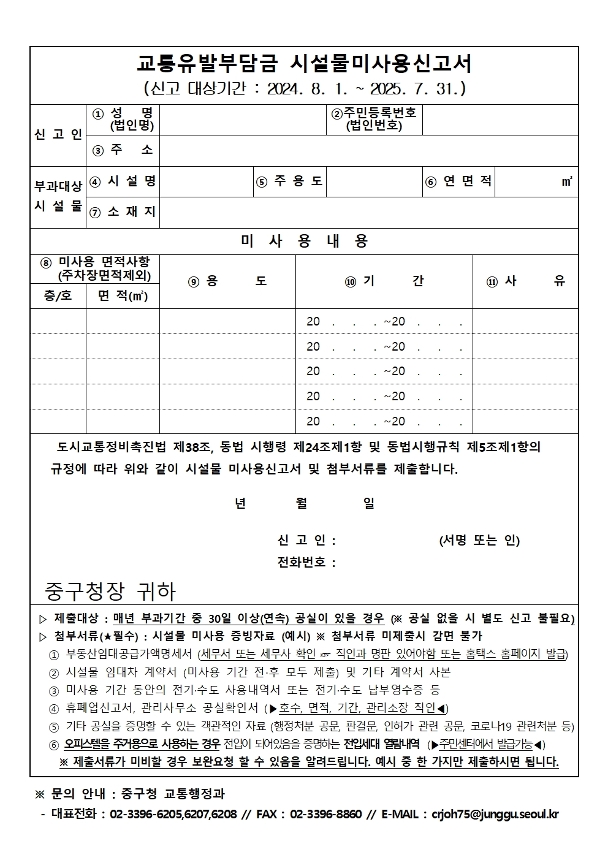 | 분류 | 수송및교통 > 물류등기타 > 대중교통 > 교통유발부담금 미사용신고 안내 | ||