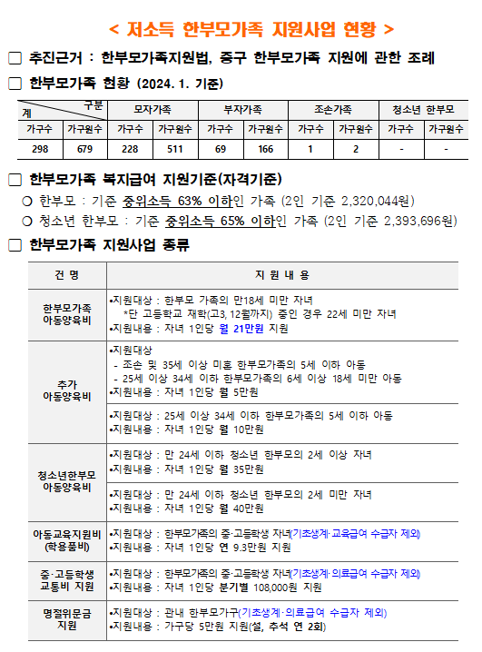 | 분류 | 사회복지 > 보육가족및여성 > 가족기능강화 > 한부모가족 사업안내 및 현황 | ||