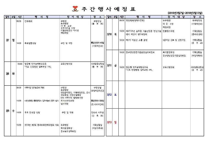 | 제목 | ★다음주(2016.03.07.~2016.03.13.) 주간행사 예정표★ | ||