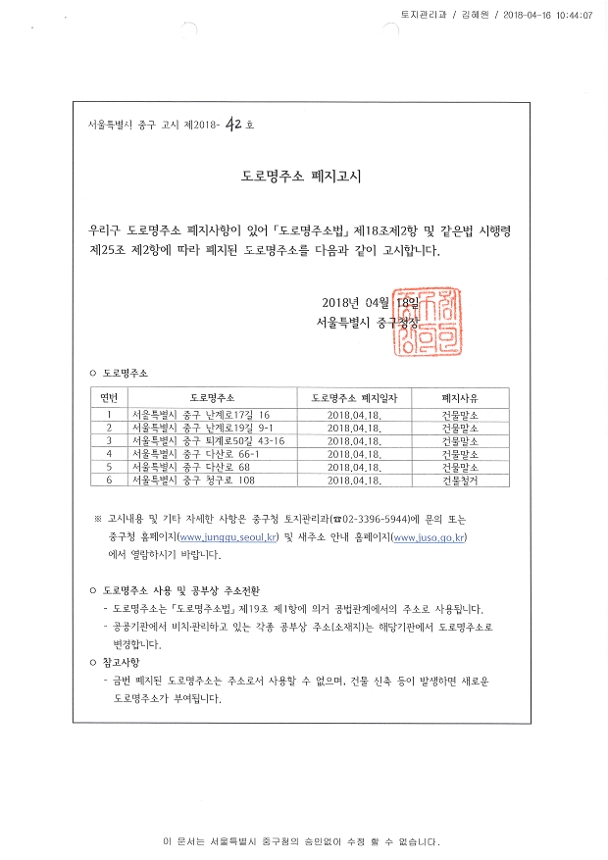 | 분류 | 일반공공행정 > 일반행정 > 주소정책 > 도로명주소 부여 및 폐지 고시 | ||