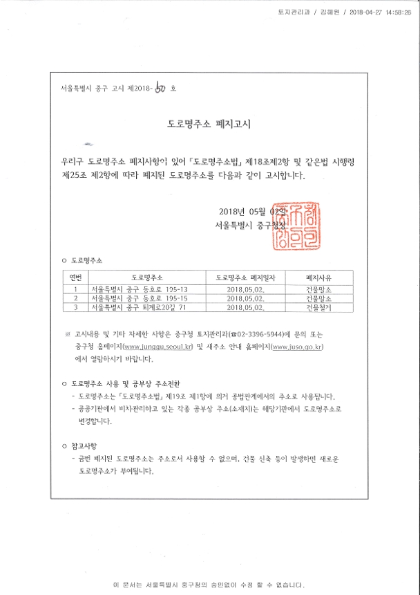 | 분류 | 일반공공행정 > 일반행정 > 주소정책 > 도로명주소 부여 및 폐지 고시 | ||