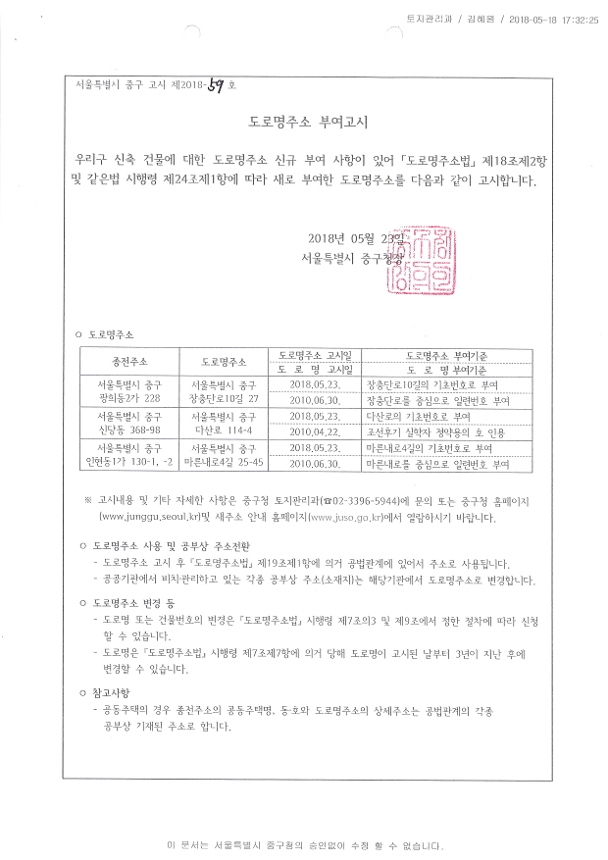 | 분류 | 일반공공행정 > 일반행정 > 주소정책 > 도로명주소 부여 및 폐지 고시 | ||