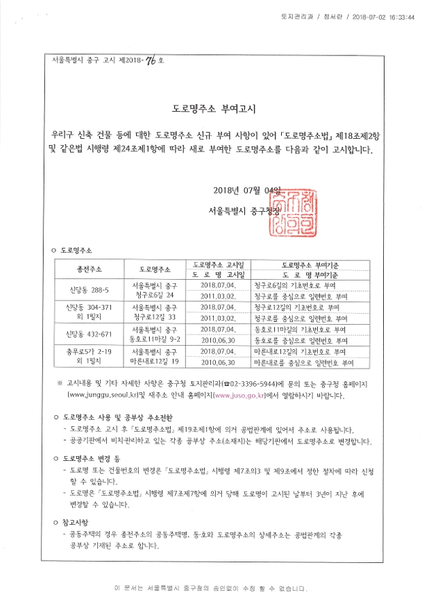 | 분류 | 일반공공행정 > 일반행정 > 주소정책 > 도로명주소 부여 및 폐지 고시 | ||