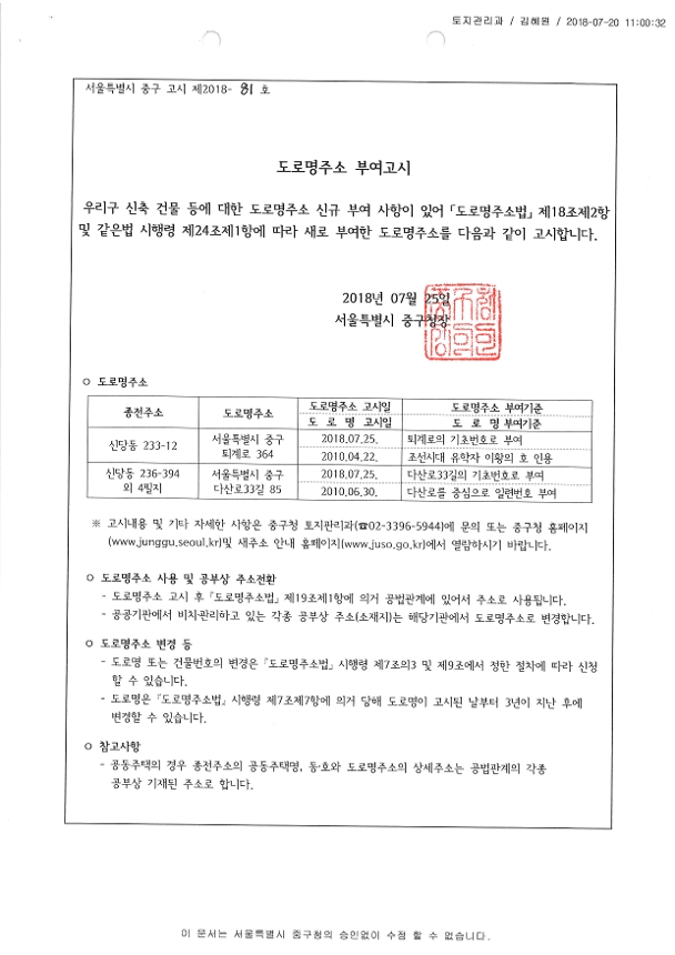 | 분류 | 일반공공행정 > 일반행정 > 주소정책 > 도로명주소 부여 및 폐지 고시 | ||
