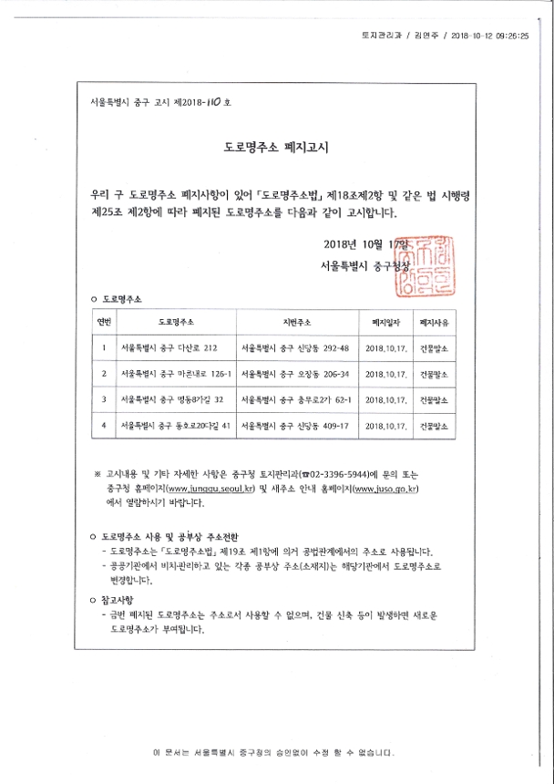 | 분류 | 일반공공행정 > 일반행정 > 주소정책 > 도로명주소 부여 및 폐지 고시 | ||