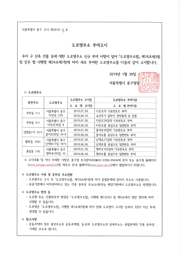 | 분류 | 일반공공행정 > 일반행정 > 주소정책 > 도로명주소 부여 및 폐지 고시 | ||