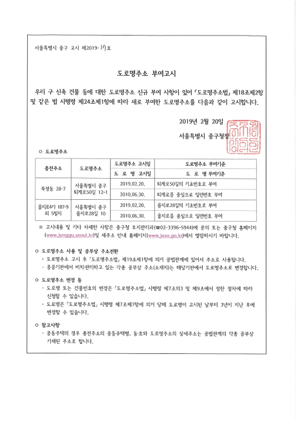 | 분류 | 일반공공행정 > 일반행정 > 주소정책 > 도로명주소 부여 및 폐지 고시 | ||