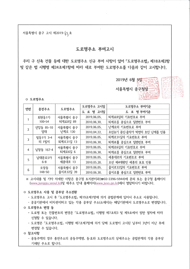| 분류 | 일반공공행정 > 일반행정 > 주소정책 > 도로명주소 부여 및 폐지 고시 | ||