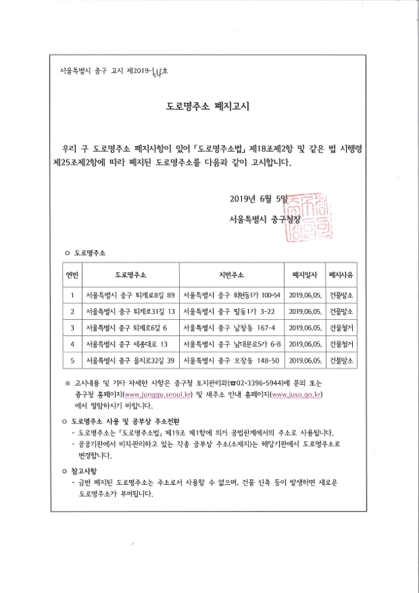 | 분류 | 일반공공행정 > 일반행정 > 주소정책 > 도로명주소 부여 및 폐지 고시 | ||