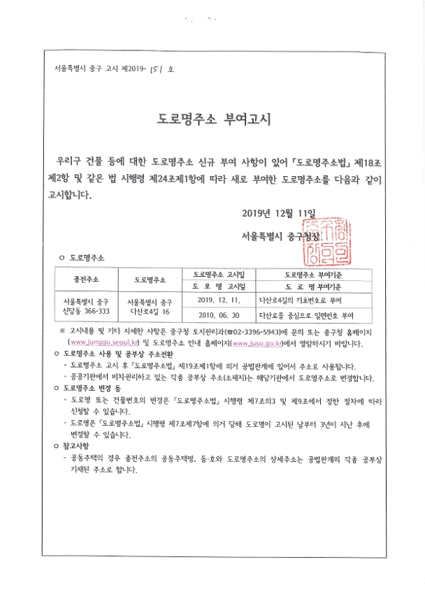 | 분류 | 일반공공행정 > 일반행정 > 주소정책 > 도로명주소 부여 및 폐지 고시 | ||