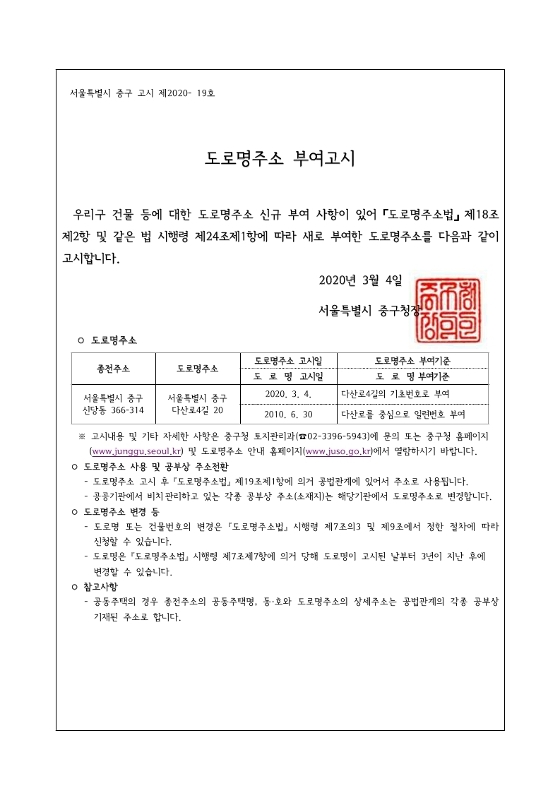 분류 일반공공행정 > 일반행정 > 주소정책 > 도로명주소 부여 및 폐지 고시