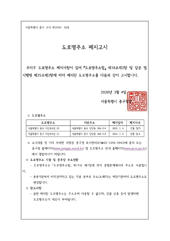 | 분류 | 일반공공행정 > 일반행정 > 주소정책 > 도로명주소 부여 및 폐지 고시 | ||